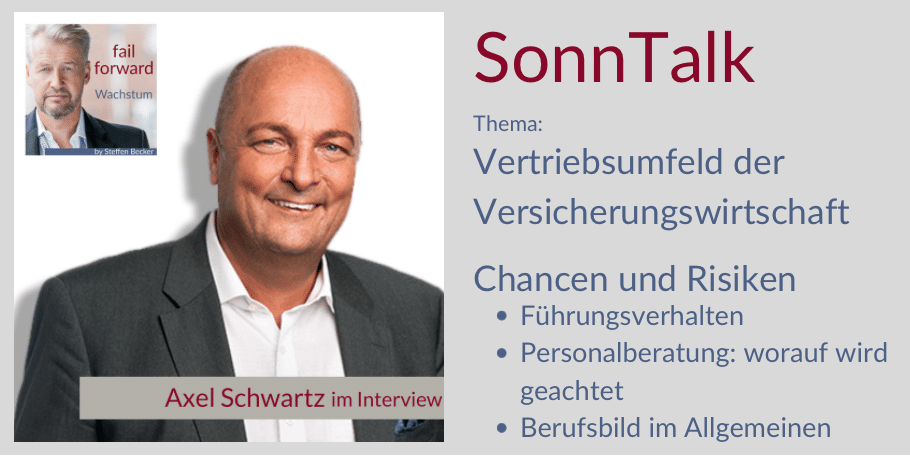 Axel Schwartz war am 22. November zu Gast im SonnTalk – einer Online-Interviewreihe von Steffen Becker. Der Managementberater und ehemalige Unternehmer unterstützt Firmen in Fragen der Digitalisierung und bei Veränderungsprozessen.  Unser Geschäftsführer stand Rede und Antwort zu den Vor- und Nachteilen des Unternehmertums und den Herausforderungen, die es mit sich bringt von der sicheren und exponierten Anstellung in die Selbstständigkeit zu wechseln. Darüber hinaus war das Berufsbild des Versicherungsvermittlers ein viel diskutiertes Thema, das sich wegen der Digitalisierung und einer stetigen Professionalisierung des Berufsstandes stark verändert hat und weiter verändern wird.  Das ganze Interview sehen Sie jetzt auf Facebook. Jetzt reinschauen: https://www.facebook.com/1522117469/videos/10224693848043231/ Weitere Infos zu Steffen Becker: www.steffenbecker.com